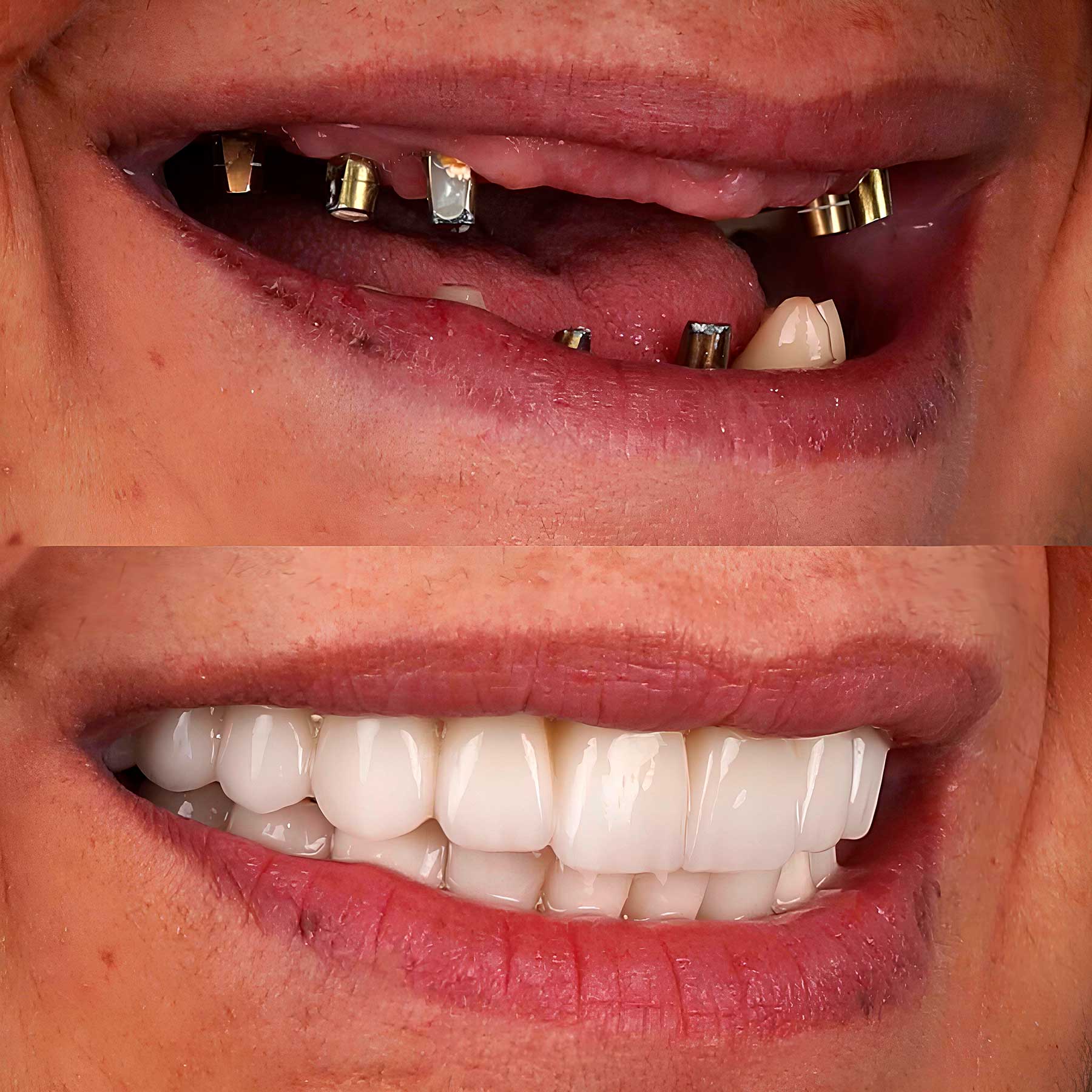 El número de implantes no siempre será el mismo que el de dientes perdidos, ya que en ocasiones dos implantes permiten reponer cuatro piezas, o incluso podemos aplicar la técnica de All on Four o All on Six donde mediante la colocación de sólo 4 ó 6 implantes, podemos reponer toda una arcada con prótesis fijas de zirconio. Estas últimas dos técnicas, con frecuencia se pueden hacer con carga inmediata de los implantes donde el paciente se va con dientes fijos el mismo día.